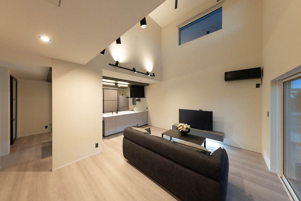 白い壁とアッシュなウッド調の床の空間を、ライン照明を使ってスタイリッシュに仕上げるなど、飽きのこないシンプルなデザインでありながら、毎日が楽しくなる演出を。木材の色や素材は、お好みに合わせて選べます。
